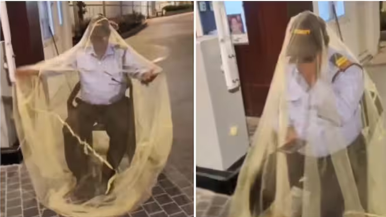 মশারিতে পুরো শরীর ঢেকে ডিউটি করছেন নিরাপত্তা প্রহরী